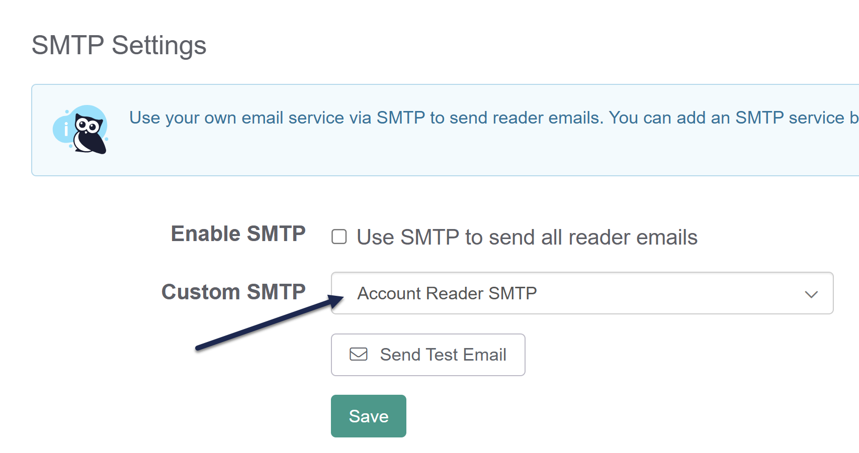 ----------------------------------- - Once you confirm receipt of your test email, check the Enable SMTP box to Use SMTP to send all reader emails.