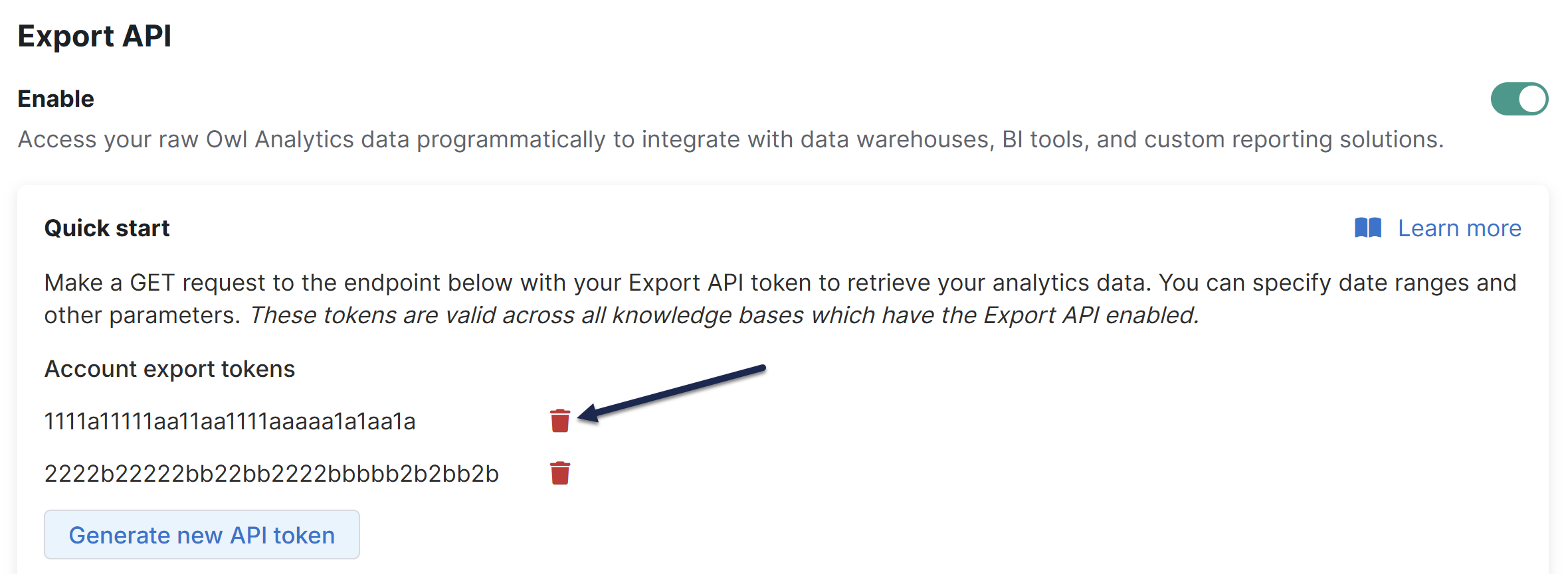 - In Export API in the Quick start section, select the trashcan icon next to the token you wish to delete: