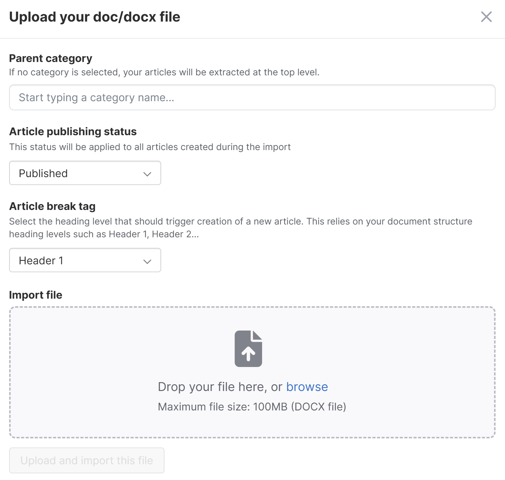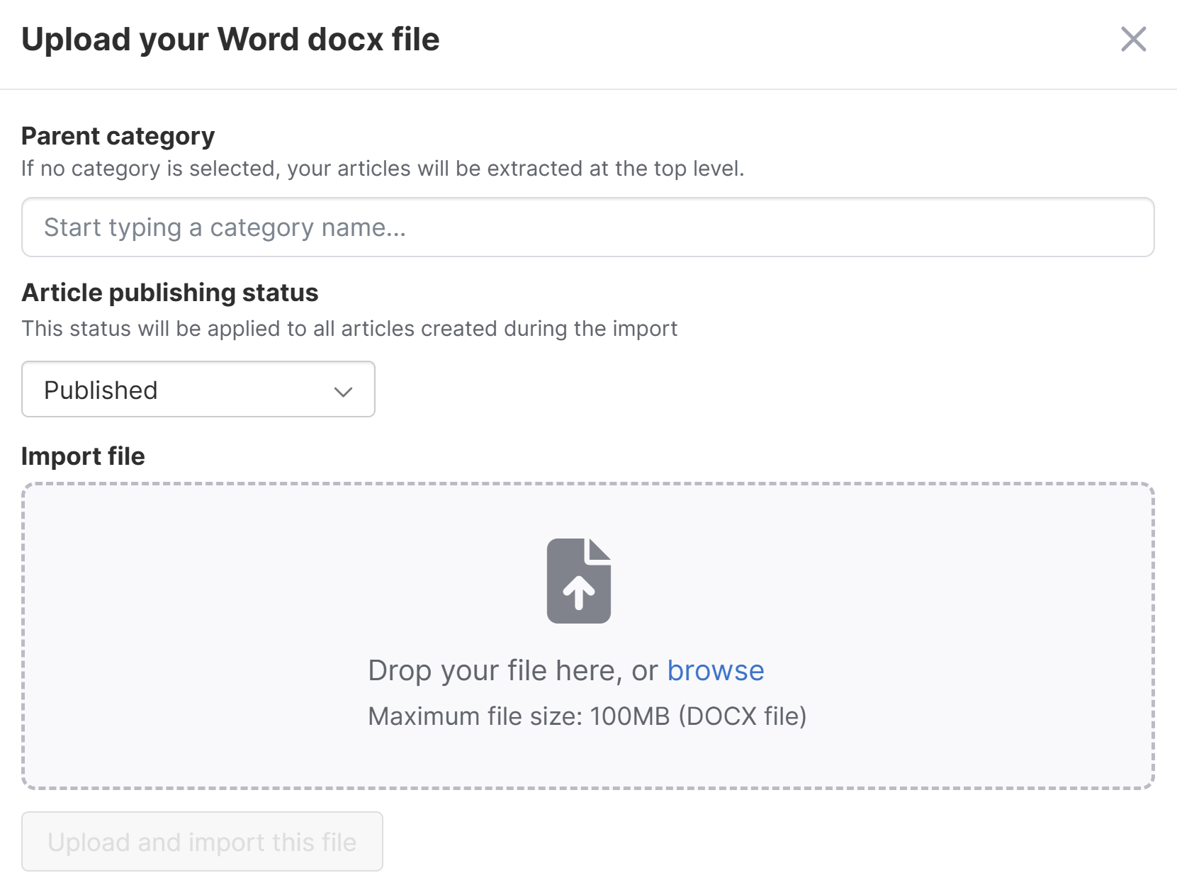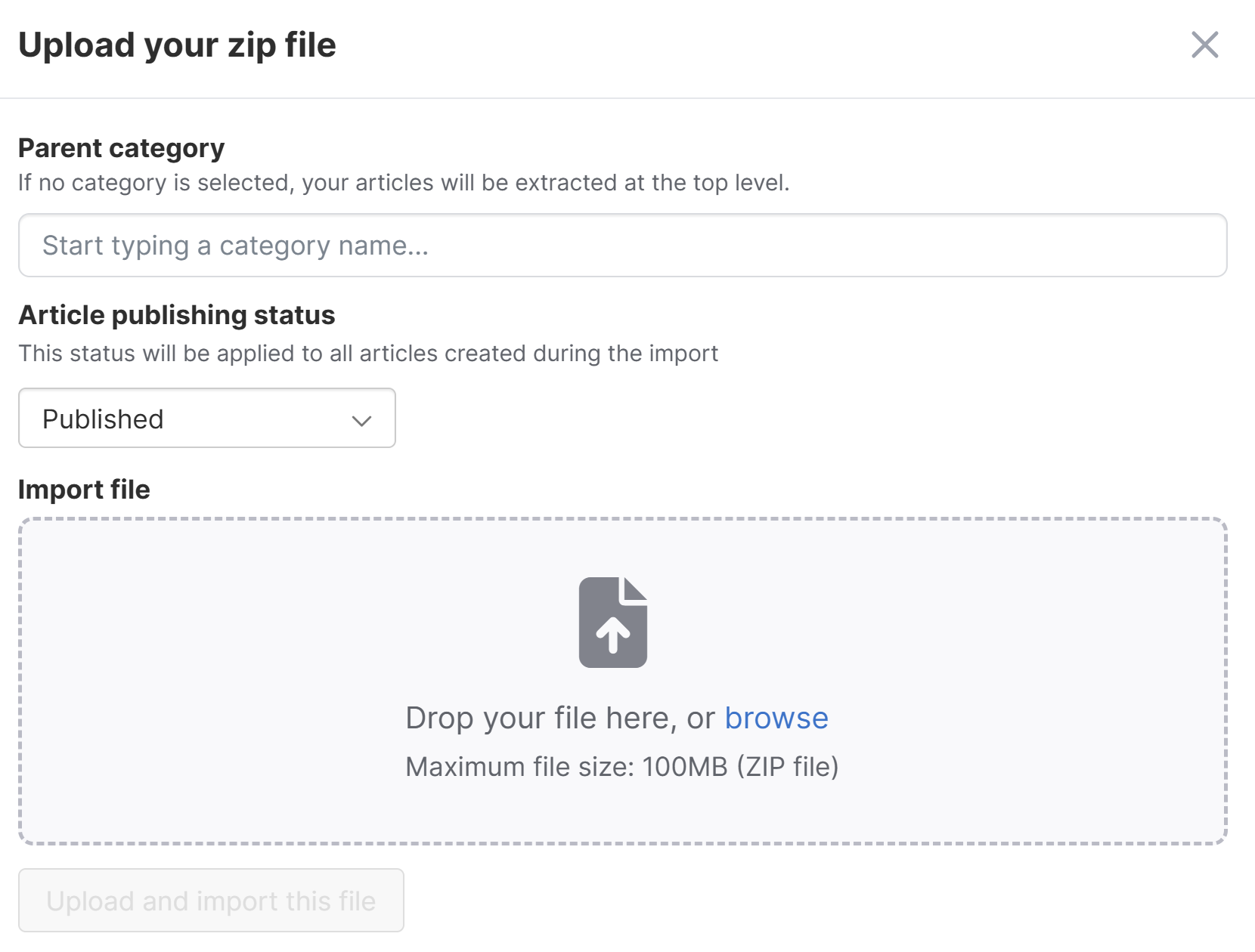 Sample single article upload modal - To create the imported article within an existing category, start typing the name of the category in Parent category. A dropdown appears as you type. Select the category from that list. To create this article as a top-level article, don't enter anything in Parent category.