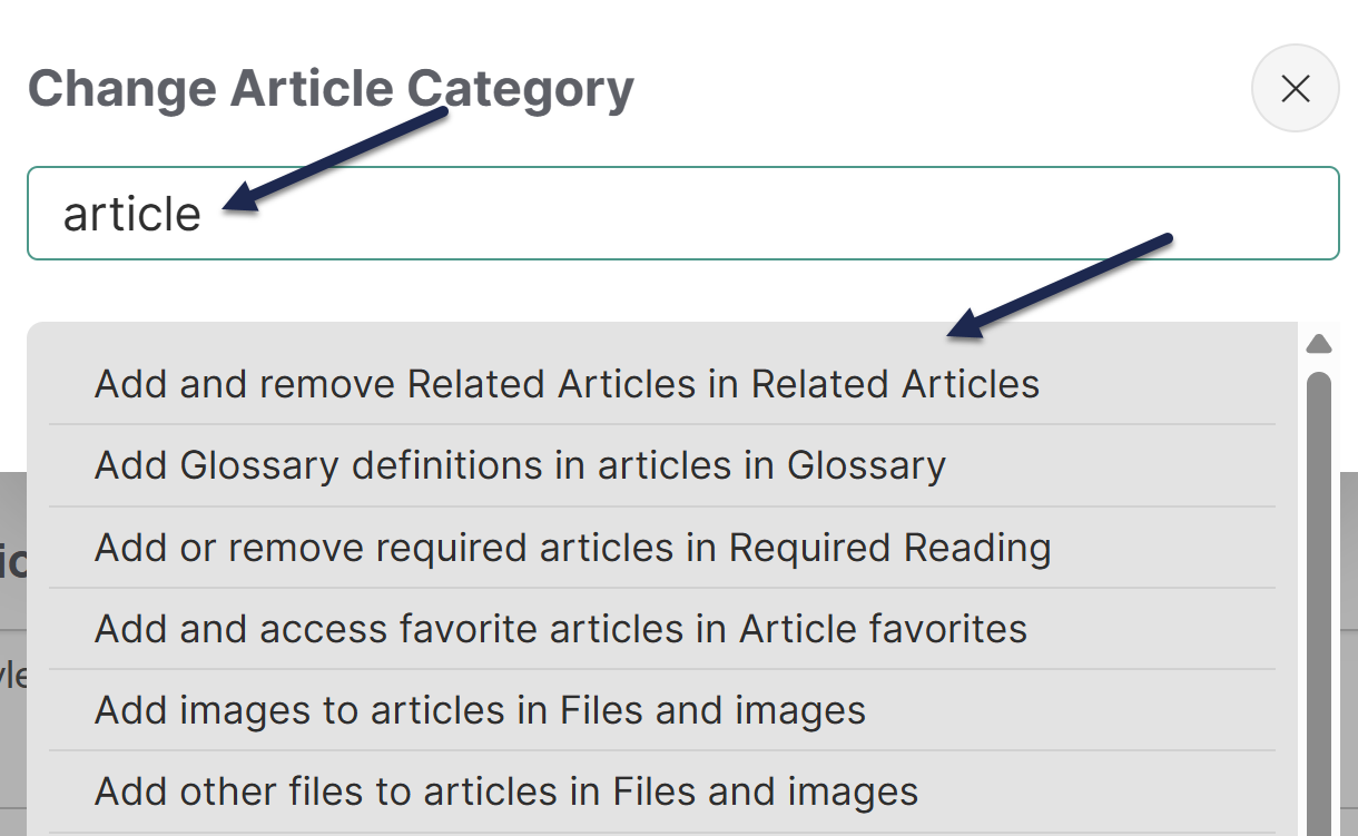 - The Change Article Category (article editor)or Change Parent Category (category editor) modal opens. Start typing the name of the category you'd like to move this content to.