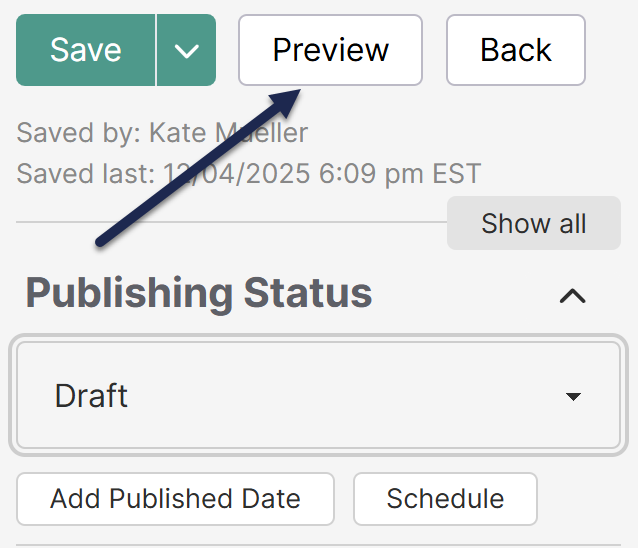 The Preview button lets you view an article in a Draft state as it will appear when published