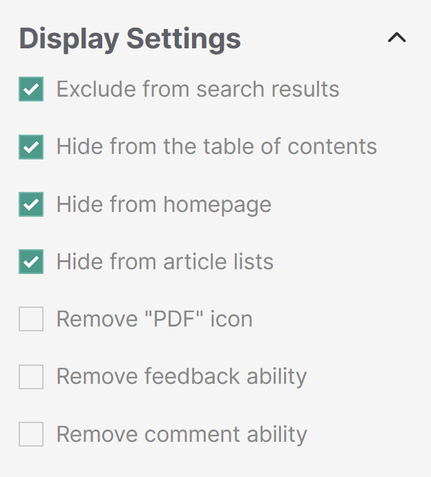 - Scroll to the Display Settings section and check the boxes next to Exclude from search results, Hide from table of contents, Hide from category landing page, and Hide from widgets. Refer to Display Settings for more information on these options.