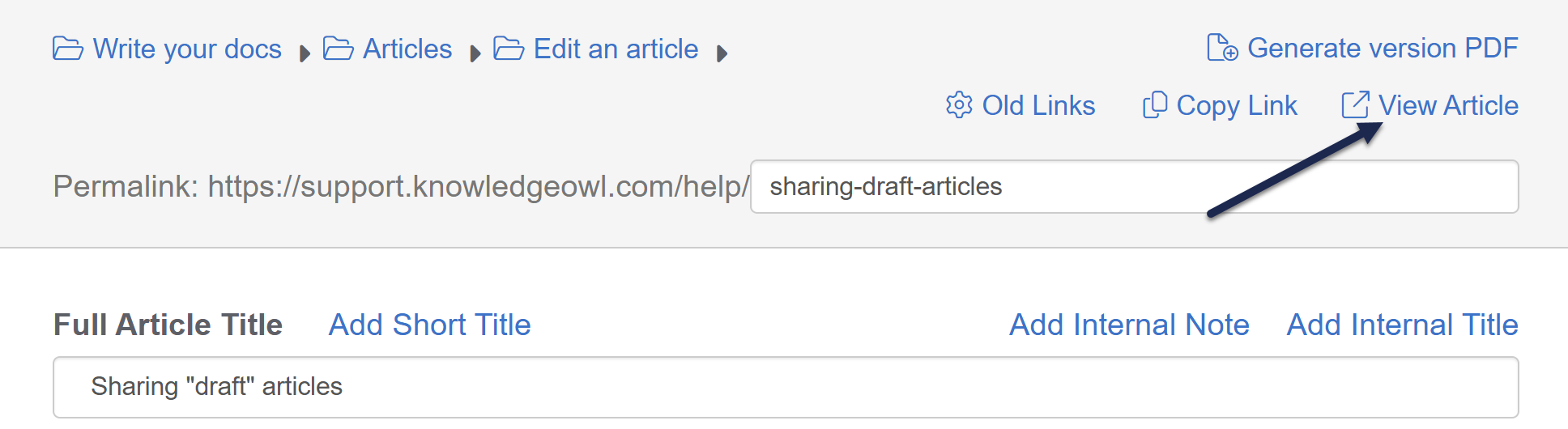 The View Article link appears once an article is published--it will open the live article in a separate tab - This will open the article within the knowledge base in a separate tab. Copy the URL it opens to.