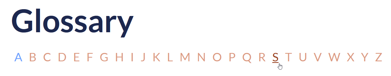 /* Set color of active Glossary navigation letters */ a.glossary-jump-to-link:not(.btn) { color: #1f9baa; } - To change the color, update the hex code in line 3 to be the color you'd like. You can also add additional styling, like changing the font-weight, font-family, underlining, etc.